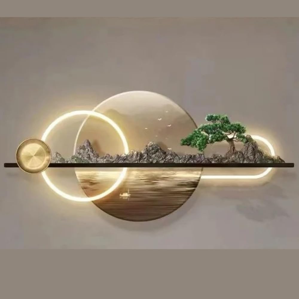 Metal wall art sculpture features a dynamic interplay of shapes and colors....