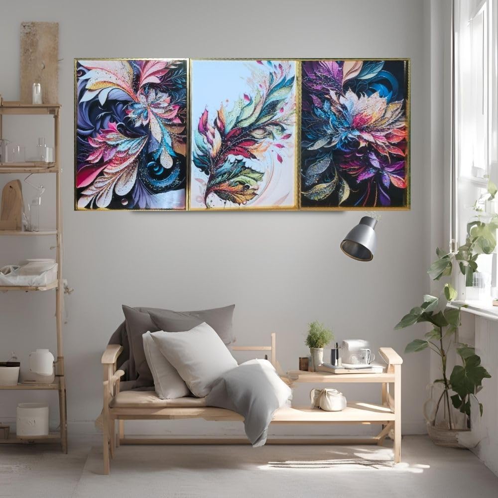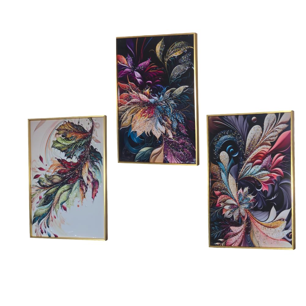 • Luxurious Wall Decor: This set of three crystal paintings features intricate designs showcasing vibrant feathers and leaves in shades of blue, gold, and other colors, framed in elegant gold for a touch of luxury.