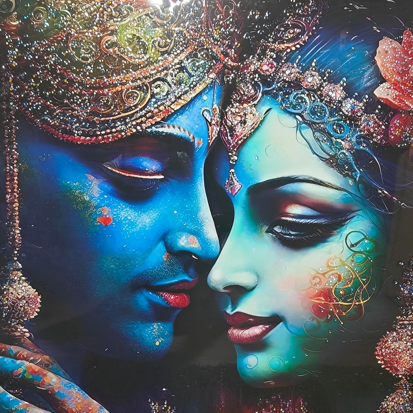 • Vibrant Floral Adornments: The glossy crystal painting is embellished with stunning flower garlands, each petal highlighted with crystal work, adding depth and texture to the art, and symbolizing devotion and beauty.